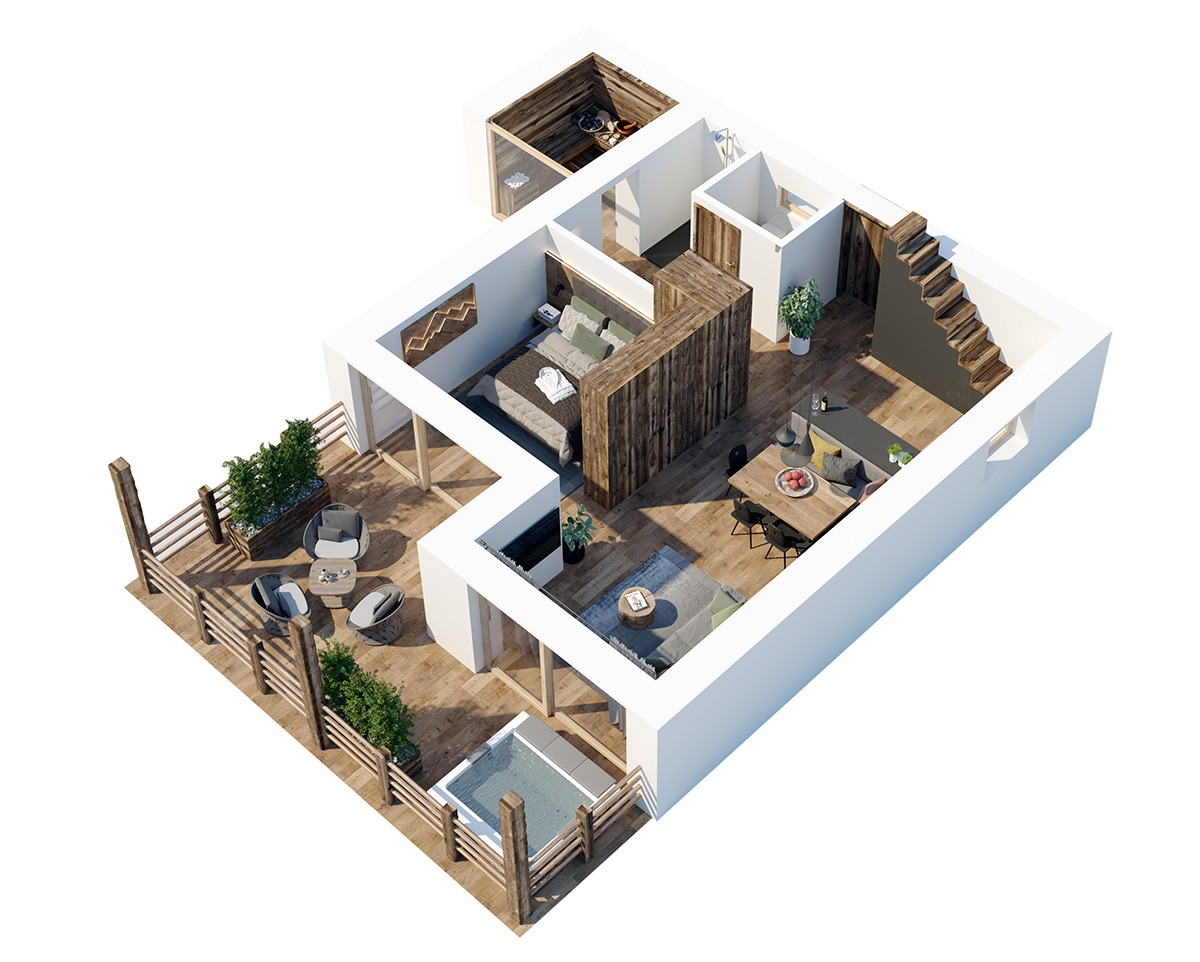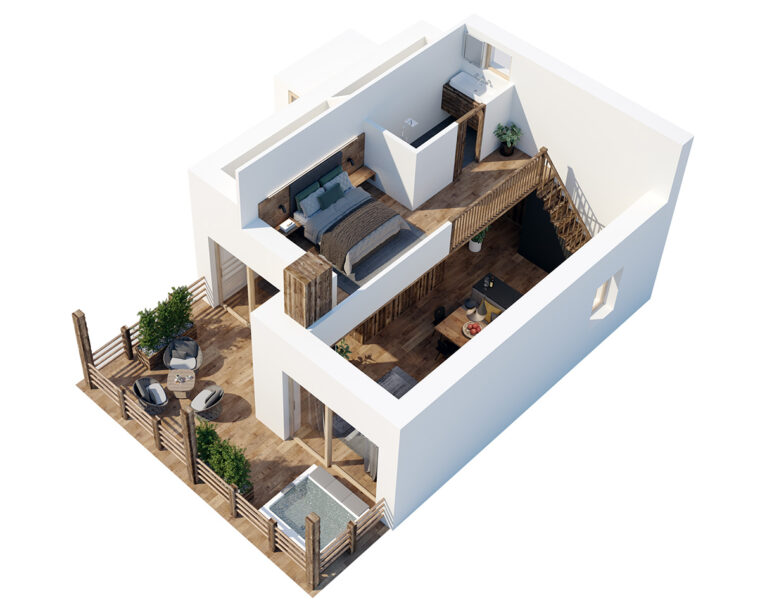 Wohnen auf zwei Etagen im elegant-originellen Baumhaus-Chalet. Ein Hochgefühl für die Seele. Die Freiheit, nach der wir uns das ganze Jahr sehnen, mit allen Sinnen spüren.