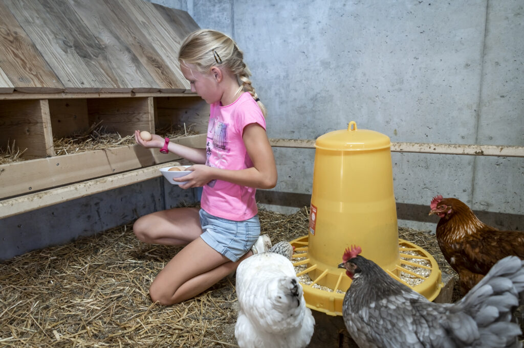 Im Hühnerstall ist immer was los – fröhliches Gegacker und quirlig-neugierige Wesen die sich um ein Körnchen streiten. Und das Beste: die Kinder dürfen am frühen Morgen die Eier für das Frühstück selber holen.